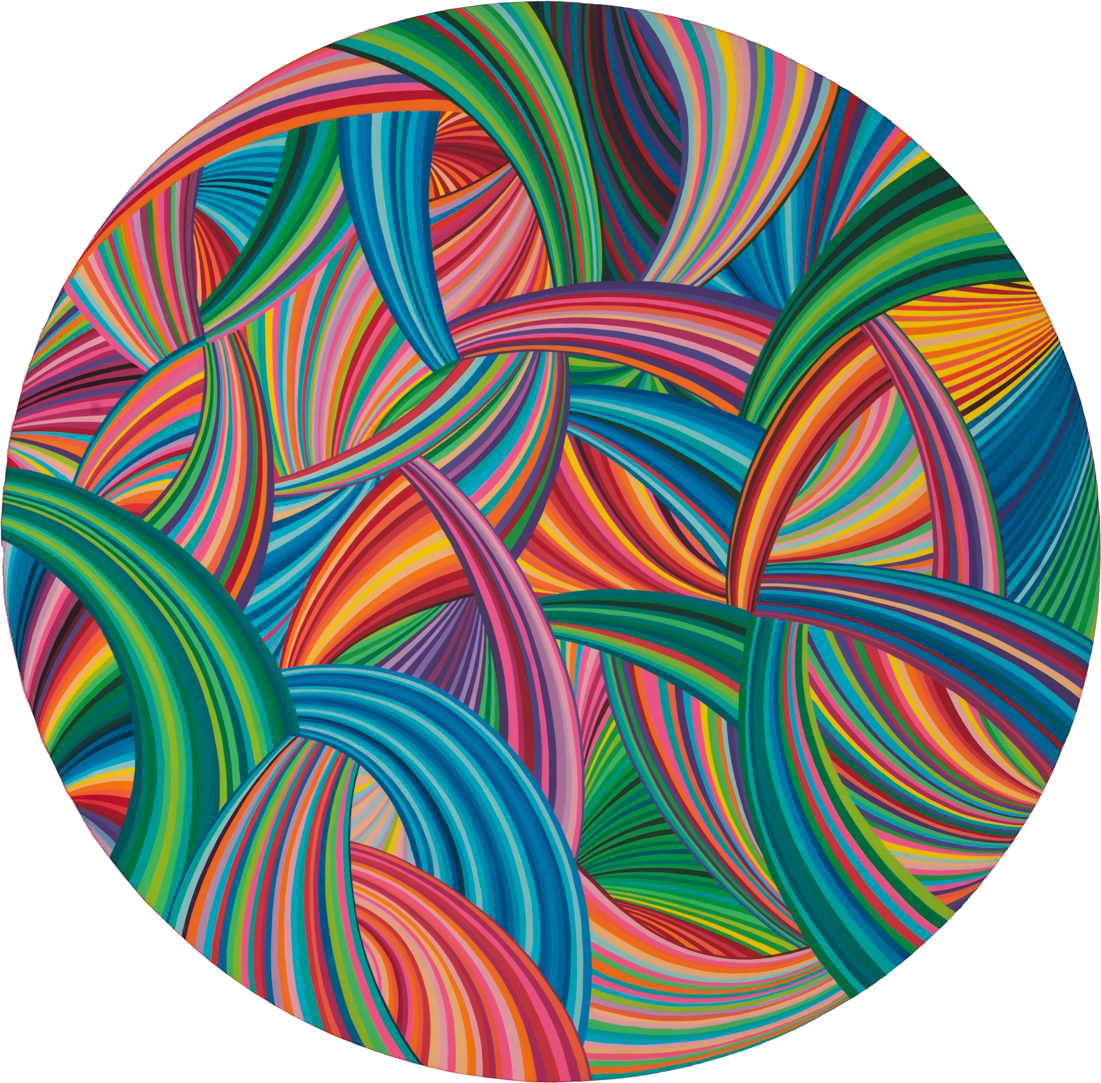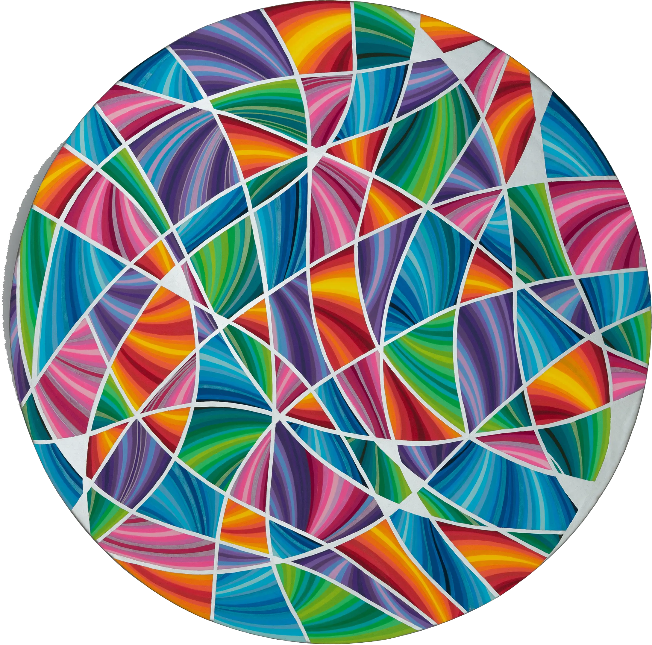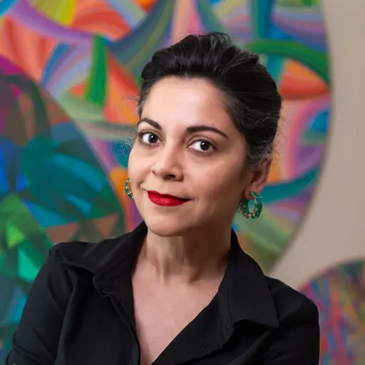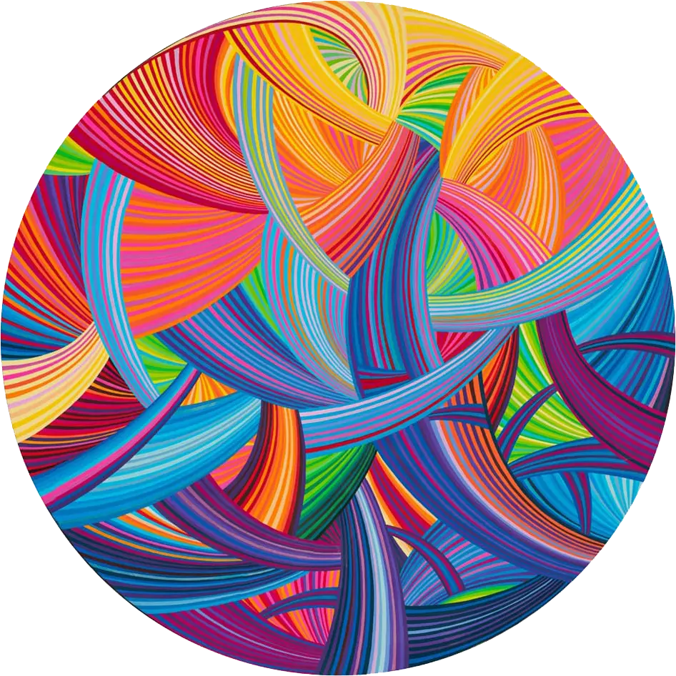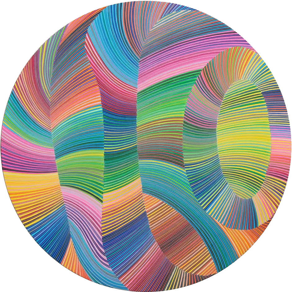 Naina Redhu is a contemporary artist known for her vibrant geometric abstractions, meticulously hand-painted with rhythmic lines on circular canvases. Her distinctive artistic style, initiated in 2019, merges dynamic patterns and an energetic palette to communicate themes of growth, self-discovery, and the intricacies of human emotion. Naina’s paintings radiate optimism, vitality, and a profound joy, inviting viewers to find their unique emotional connections within the structured chaos.